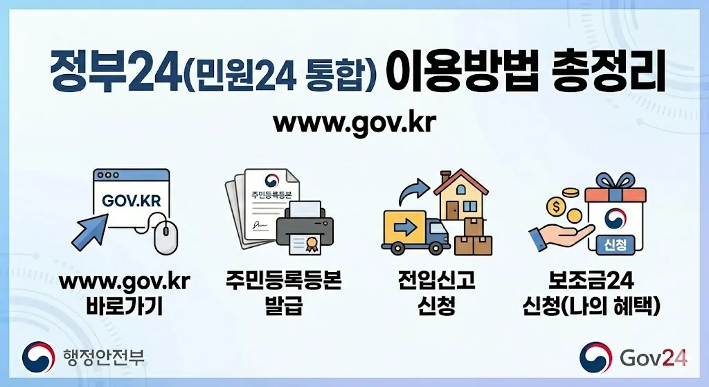 민원24 정부24 통합 홈페이지(www.gov.kr) 바로가기와 주민등록등본 발급, 전입신고, 보조금24 이용방법에 대해 알아보았습니다. 관공서 방문 없이 온라인으로 편리하게 각종 민원 업무를 처리할 수 있으니, 아래 버튼을 통해 정부24에 바로 접속해보세요.